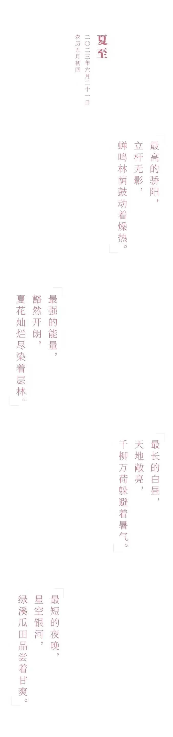 夏至,是二十四节气中第十个节气。夏至占据多个“之最”:是古时最早被确定包括春分、秋分和冬至在内的四个节气之一;夏至日太阳直射北回归线时,是北半球各地白昼时间达到全年最长而夜晚最短的一天;是北半球在一年中,正午太阳的地平高度最高的一天;是北半球获得太阳辐射能量最多的一天;夏至还是二十四节气中拥有名字最多的,在漫长岁月里,人们对夏至的称呼有:长日、永日、日永、三时、长至、至日、祥风、八节、北至……等等。