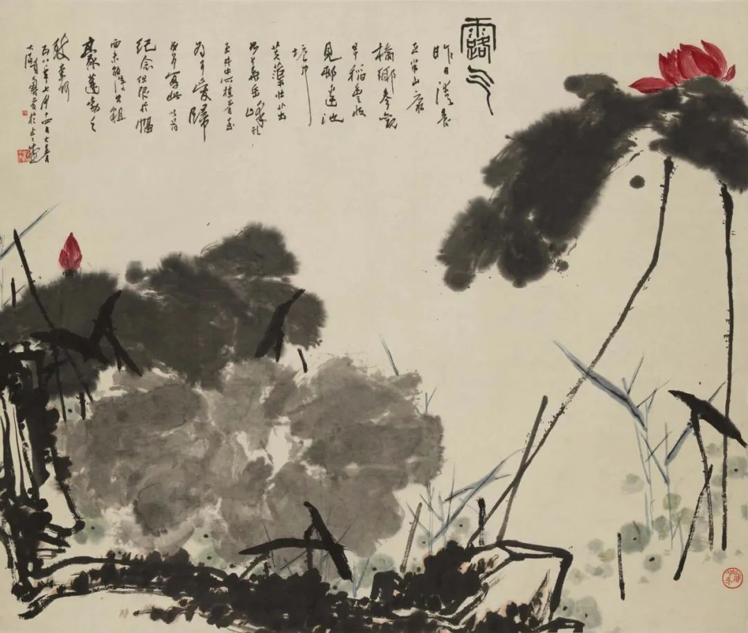 他的画风气势磅礴,奇崛高古,“一味霸悍”之气撼人心弦。其用笔古拙劲健,常以书入画,多以隶书、魏碑方折觚线勾勒造形,如“屋漏痕”、“折钗股”,大起大落,收放自如。作于1958年的《露气》,是潘天寿与浙江美院师生下乡、参观早稻丰收后所创作。此画继承了吴昌硕写意花鸟画大气磅礴的风格,落墨凝练泼辣,并集众家之长,将中国画中点、线、面的表现形式发挥到极致。此画“从高处、远处、大处和最新奇处立意”,几片水墨淋漓的荷叶,恣意放纵,浓淡有致。莲茎用笔老辣遒劲,错落有致,穿插于荷叶间。半掩于荷叶之后的莲花,一收一放,着色古艳清雅。底边以浓重线条所绘的岩石,沉着痛快,将整个画面收住。虽未直接渲染露气,但以酣畅笔墨点出了露气弥漫的氛围,给人以慑人的张力和极简的结构美,同时洋溢着勃勃生机。此画“意写而工巧”,经得起深入推敲,真正做到“致广大,尽精微”。