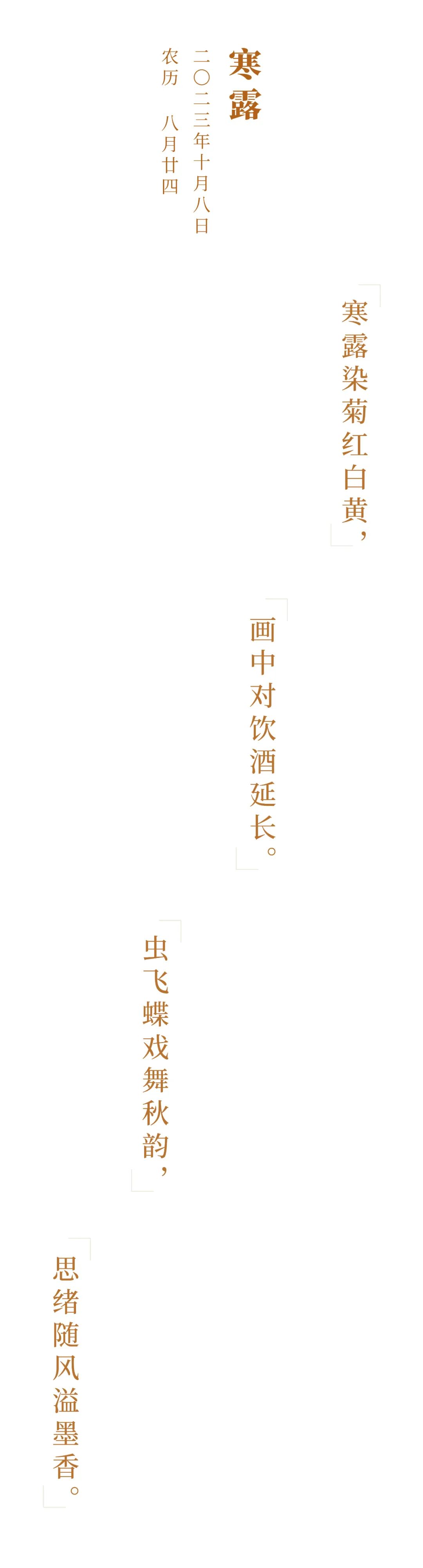 寒露染菊红白黄,画中对饮酒绵长。虫鸣蝶戏舞秋韵,思绪随风溢墨香。