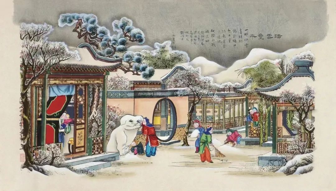 款识: 瑞雪丰年。一时快雪喜晴烘,游戏场中六七童。好趁仓盈庾亿地,何妨白战补天功。
