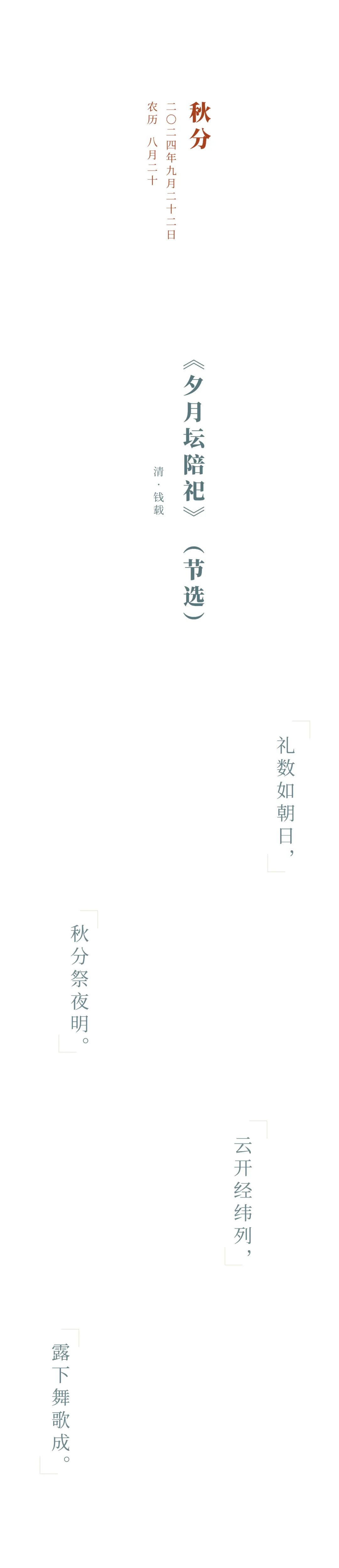 秋分,是秋季的第四个节气。这天昼夜均分,且居秋季九十天之中,也有“平分秋色”的意思。秋分曾是传统的“祭月节”,早在周朝时就有“春分祭日,夏至祭地,秋分祭月,冬至祭天”的习俗,后来秋分的祭月节慢慢演变成了今天的中秋节。祭月,不仅表达中国人对月神的崇拜,也是祈求月神降福人间的一种美好心愿。