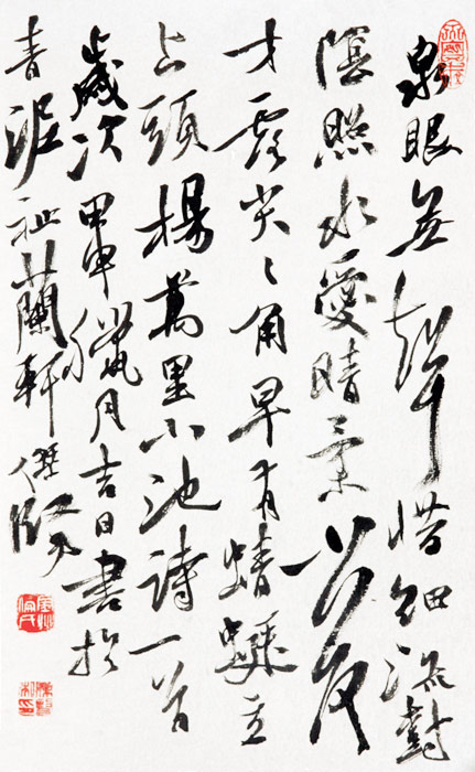 | 伦杰贤 41cm×25cm 2005年 释文: 泉眼无声惜细流,树阴(荫)照水爱晴柔。 小荷才露尖尖角,早有蜻蜓立上头。 杨万里 小池诗一首 岁次甲申腊月吉日书于青泥祉兰轩 杰贤 |