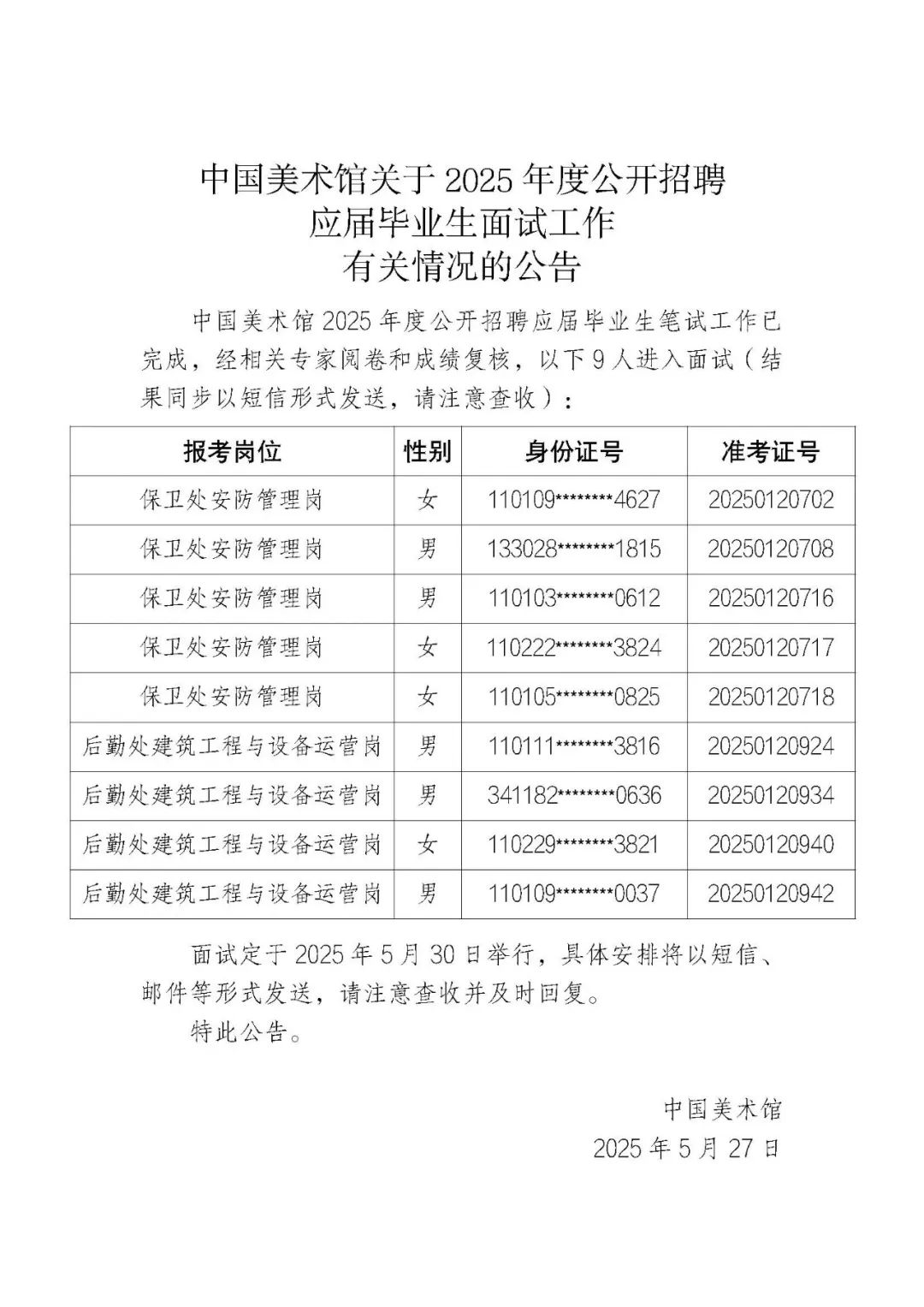 中国美术馆关于2025年度公开招聘应届毕业生面试工作有关情况的公告