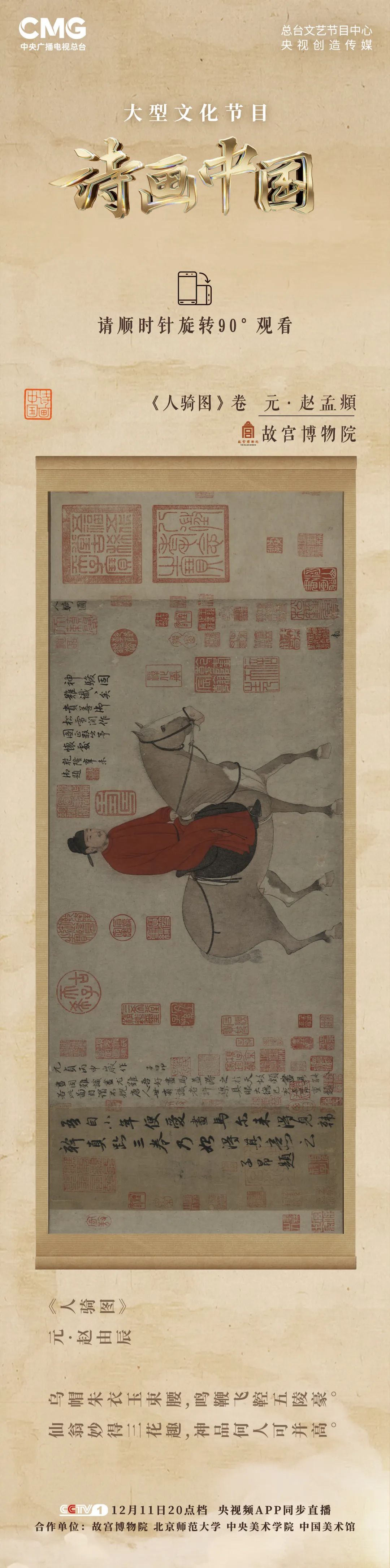 《人骑图》卷是元代画家赵孟頫的经典之作,画面简洁明了,作者用铁线游丝的细腻笔法,刻画了一位风度翩翩的男子,身穿红袍执鞭骑马的形象。开卷人郭达化身画中的红衣骑马人,依次走进赵孟頫的名作《重江叠嶂图》卷、《鹊华秋色图》卷、《秋郊饮马图》卷,开启了一段画境穿梭的奇妙旅程。