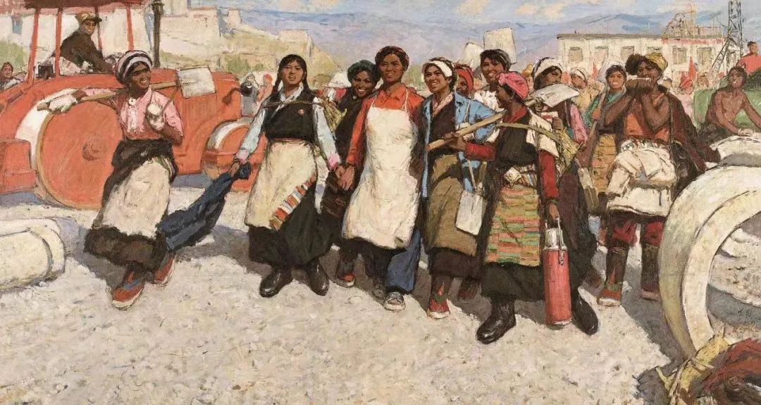 在这幅写实主义风格的油画作品中,艺术家以平实的绘画语言,描绘了一群藏族青年筑路工人于放工途中边走边唱的生动场景。画面的焦点是走在前排的青年女工,他们身姿健硕,朝气蓬勃,脸上洋溢着喜悦和自信,四周的工友循着歌声微笑着看向他们。画面的远景是壮阔雄伟的布达拉宫和绵延不绝的山峰,饱和的色彩和强烈的明暗对比营造出雪域高原明丽的光感,大色块和笔触的运用则使作品浑厚且充满张力。在这幅时代特征鲜明的油画作品中,潘世勋画出了新西藏建设者们意气风发、斗志昂扬的精神面貌,成功地塑造了藏族青年劳动者的时代肖像,从而为中国现代美术史留下一件极为重要的西藏主题绘画作品。