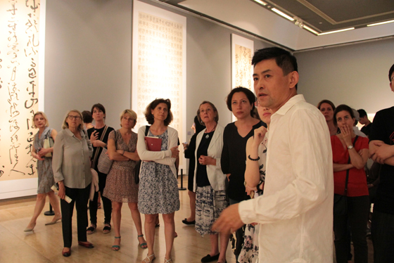 5月18日上午,在华法国人协会会员一行抵达中国美术馆,中国美术馆公共教育部副主任杨应时向法国观众简要介绍中国美术馆的情况及与法国的渊源。在中国美术馆志愿者王建南的引导下,法国观众参观了位于中国美术馆六层的“藏宝阁”的“中国美术馆典藏活化系列展:宝藏经典 活化精神——中国美术馆典藏精品陈列”,大家都被精美的馆藏作品及志愿者细致幽默的讲解深深吸引。随后,一行人来到中国美术馆一层4号展厅与参展书法家杨涛进行现场交流,气氛融洽。杨涛教授引导法国观众欣赏了展厅中的代表作品,并解答大家的问题。