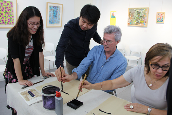 参观结束后,一行人来到中国美术馆艺术教育空间,书法家杨涛及其学生现场讲授并指导法国观众体验中国书法,大家都被中国传统书法文化的魅力和国际文化艺术交流的氛围所打动,不少法国朋友创作了人生中第一张中国书法作品,现场互动热烈,并与新结交的中国老师合影留念。交流活动结束后,法国朋友久久不愿离去,纷纷致谢并希望中国美术馆能推出更多面向外国观众的文化交流系列活动。