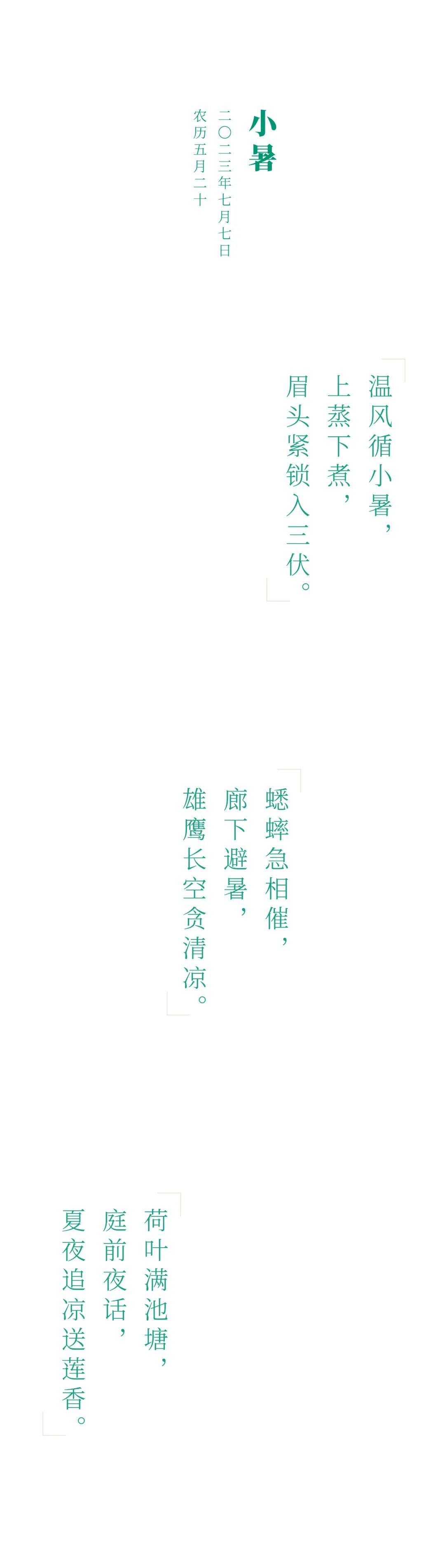 小暑的三候尽显古人充满期待和惊喜的生活:“一候温风至;二候蟋蟀居宇;三候鹰始鸷。”热风来了,气温一下子升高了,蟋蟀由田野跑到了屋檐廊下墙角处纳凉了,老鹰则飞到高空追逐清凉了。非常有代入感的小暑三侯,不仅是物候现象,更是对人们日常起居的引领。