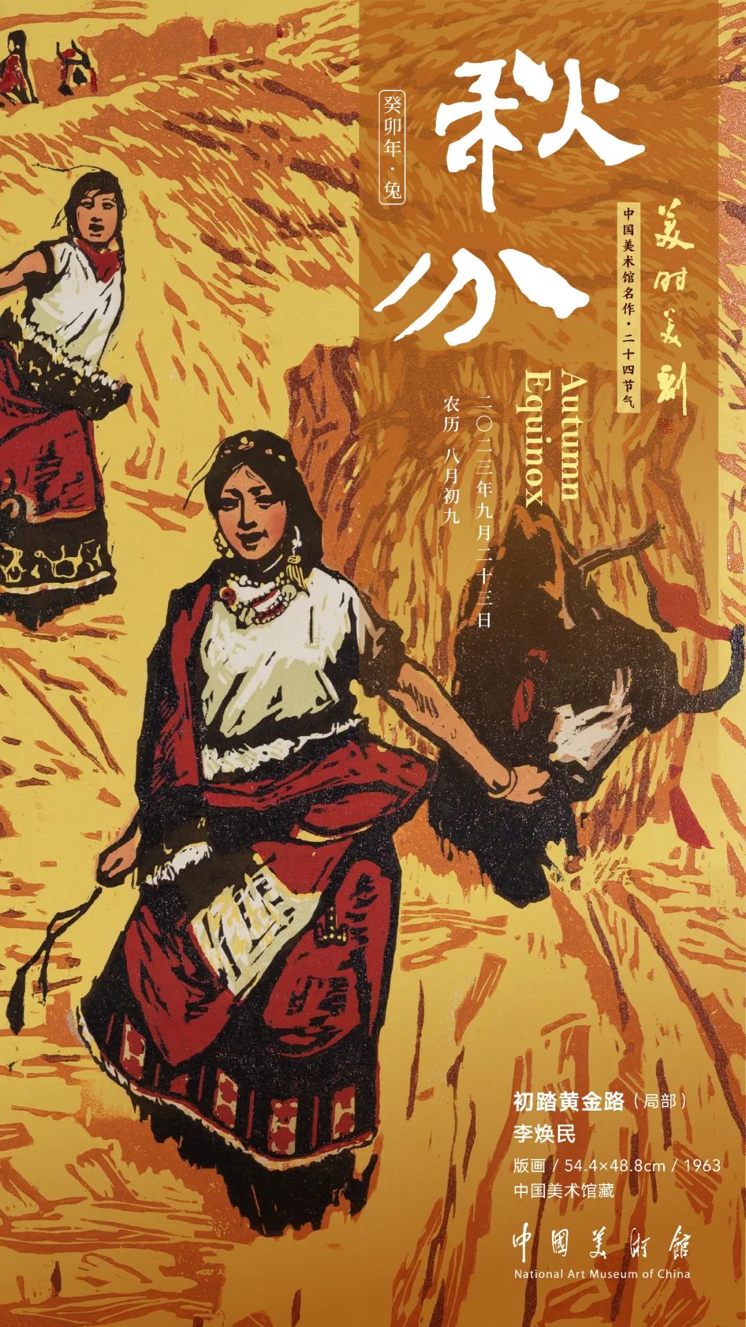 秋风吹拂,麦浪翻滚,金穗飘香,大地迎来了丰收。秋天是收获的季节,当秋风吹过田野,麦穗像黄金一样闪闪发光,《初踏黄金路》是版画家李焕民于1963年创作的一件套色木刻作品。