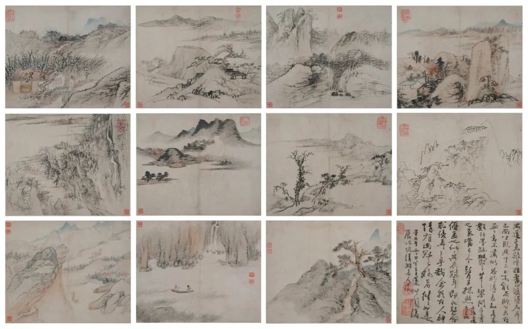 “时壬午冬日,坐青莲草阁,复展此纸。清湘老人济。”清湘老人就是明末清初画家石涛。他的这套十二开《山水》册页现收藏于中国美术馆。册页是书画作品的一种装裱形式,也是我国古代书籍装帧的一种传统形制。为了方便阅览,唐人将横卷式的书籍折叠成折扇样式,并在前后贴上厚纸作为封面,增强牢固性。初为“经折式”,后演变出“包背装”和“蝴蝶装”,沿用至今。册页一般尺幅不大,易于创作和保存,便于携带欣赏,也有利于画家以多角度展现同一个区域不同的景色,深受历代书画家喜爱。