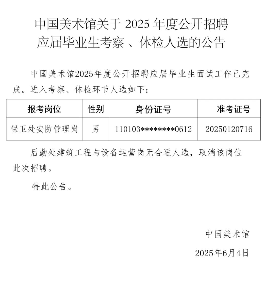中国美术馆关于 2025年度公开招聘应届毕业生考察 、体检人选的公告