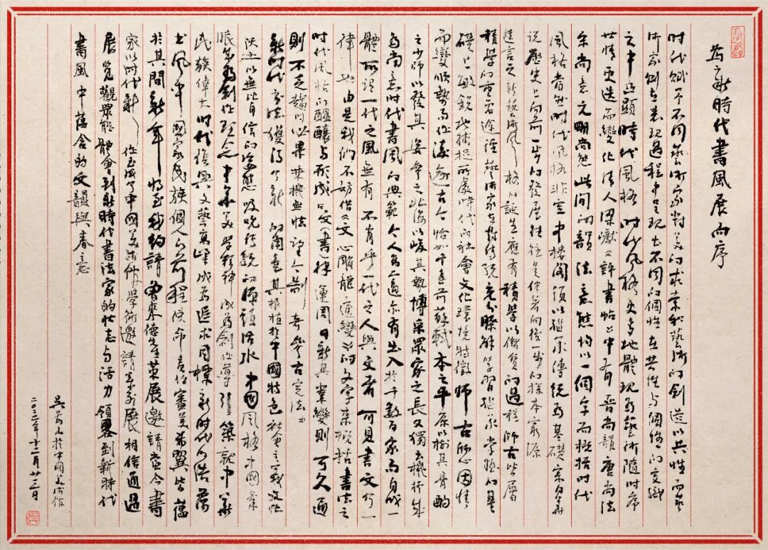 中国美术馆馆长吴为山在展览前言中表示:“时代,赋予不同艺术家对美的求索和艺术的创造以共性,而艺术家则在表现过程中呈现出不同的个性,在共性与个性的交织之中凸显时代风格。”此次展览由著名书法家曾来德担任特邀策展人,展出沈鹏、张海、孙晓云、林岫、申万胜、李刚田、胡抗美、张坤山、刘洪彪、曾来德、张旭光、曾翔、朱培尔、魏杰、陈洪武、张继、王厚祥、洪厚甜、魏广君、张公者、叶培贵、陈海良、龙开胜、尹海龙、杨涛25位书法家最新创作150余幅书法作品,让我们领略中国书法在新传统中的艺术魅力,感受中国书法在新时代的新诠释。